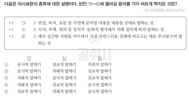 의사 표현의 종류에 대해 이해와 암기가 되었다면 빠르게 정답을 맞출 수는 문항이 출제됩니다. 그리고 문항의 내용이 의사 표현의 종류와 같이 일상생활과 익숙한 문항들이 출제되기도 합니다.
