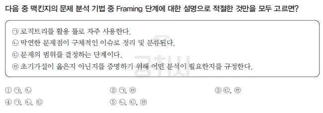 맥킨지의 문제 분석 기법에 대한 문항입니다. 모듈형에 수록된 이론의 경우엔 이렇게 별도로 공부를 하지 않으면 오답을 유추할 수도 없는 문항이 출제됩니다.